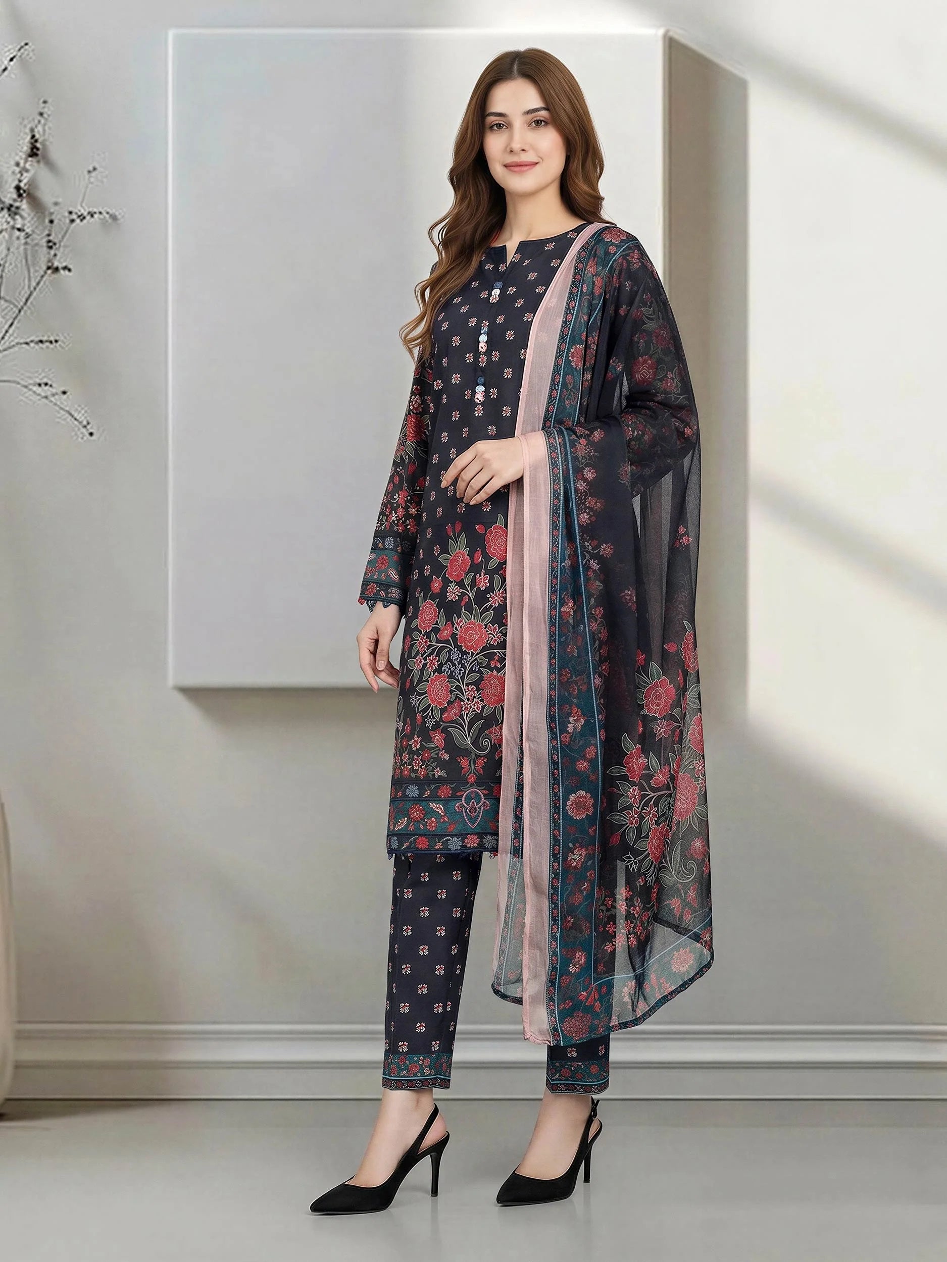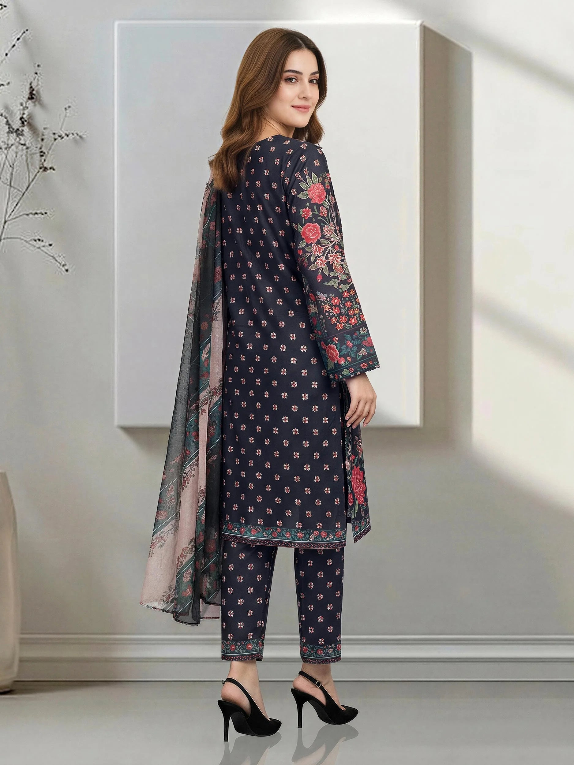 This classic unstitched 3-piece suit in a timeless black shade offers a perfect blend of elegance and versatility. The printed lawn shirt is lightweight and breathable, making it ideal for warm weather. It is paired with a graceful chiffon dupatta that adds a soft, flowing touch, along with a printed cambric trouser to complete the look. Perfect for casual wear and semi-formal occasions, this outfit allows you to stitch it according to your own style and fit.
